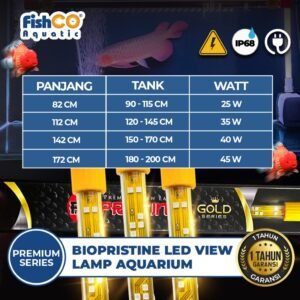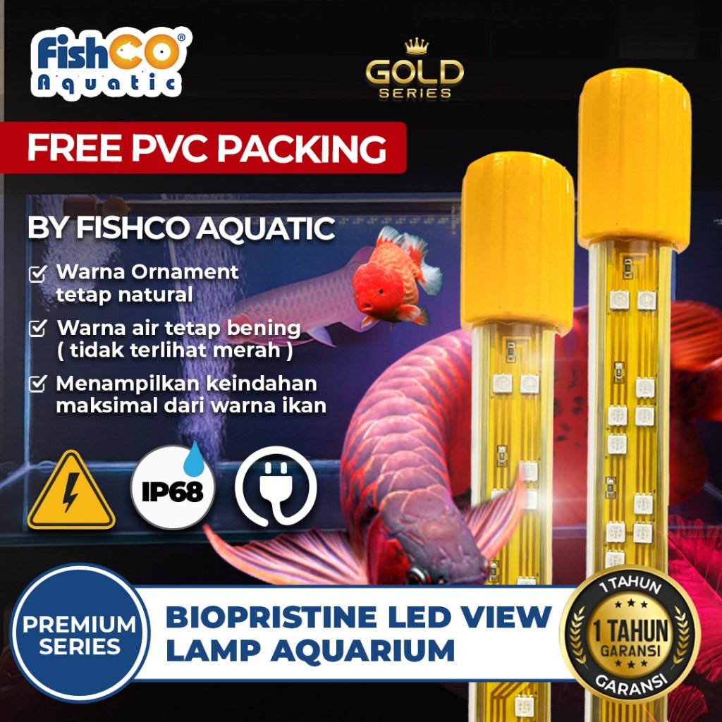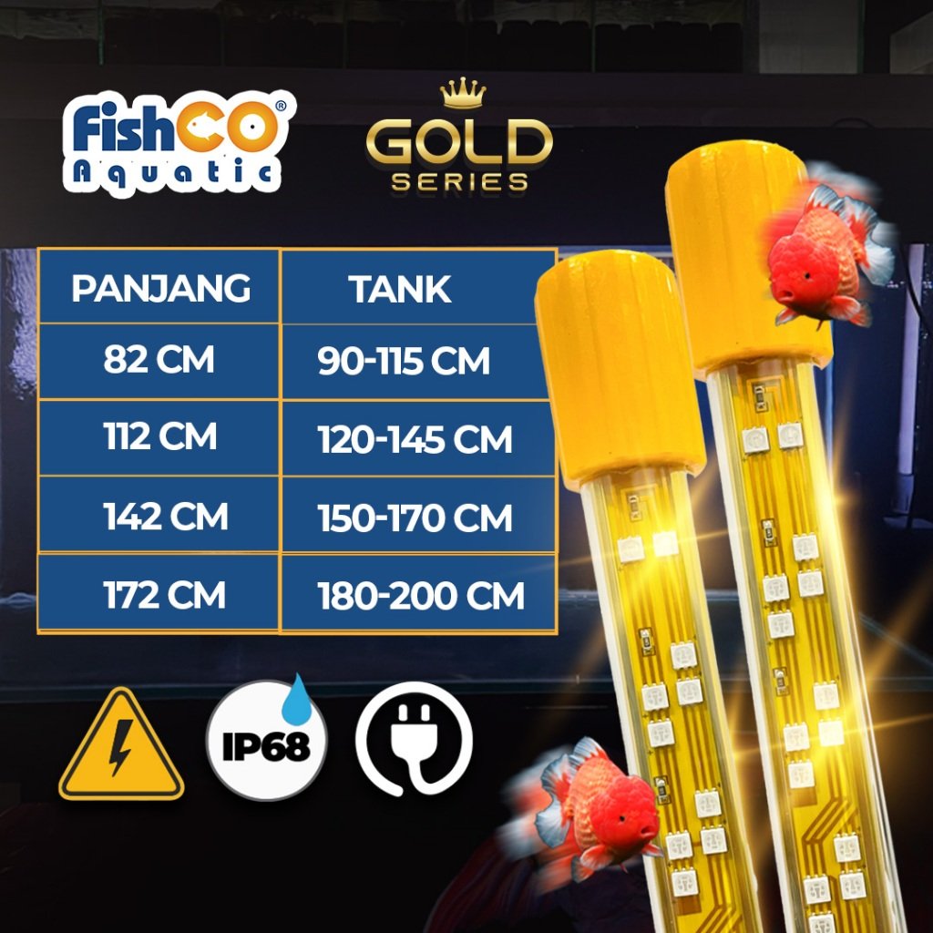 Dalam series ini fishco aquatic mengeluarkan varian terbaru yakni Gold Series , yang mana kelebihan utama ialah TABUNG PREMIUM , murni 100% kaca berkualitas tinggi sehingga kaca tidak mudah panas. Kelebihan lainnya terdapat pula DOP kaca yang sangat rekat tidak mudah ketas / rapuh karena berbahan silikon yang berkualitas, pengait terbuat dari bahan plastic HD atau HDPE murni yang aman untuk ekosistem kolam. Memiliki watt lebih tinggi dibandingkan merk lain , Semakin besar watt lampu, maka semakin terang pula cahaya yang dihasilkan.