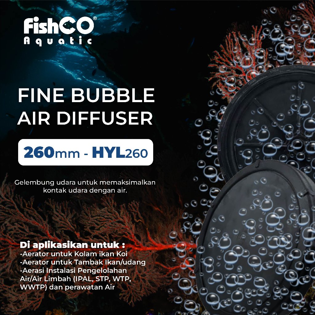 Diffuser udara dengan gelembung halus untuk meningkatkan konsentrasi oksigen didalam air, baik dalam proses aerasi untuk air limbah atau pada tambak kolam ikan dan udang untuk menjaga dan memperbaiki kualitas air.