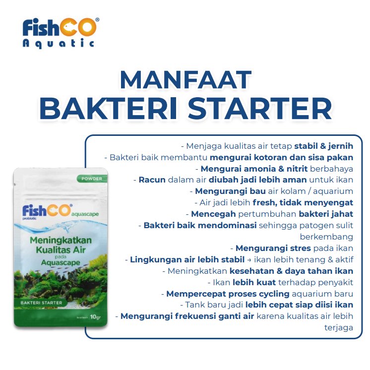 FISHCO Aquarium Probiotik Aquascape 10gr adalah solusi terbaik untuk menjaga kualitas air aquarium dan kolam ikan predator tetap jernih, sehat, dan bebas bau. Mengandung kombinasi bakteri baik & enzim aktif yang bekerja cepat mengurai kotoran, amonia, dan zat berbahaya lainnya.